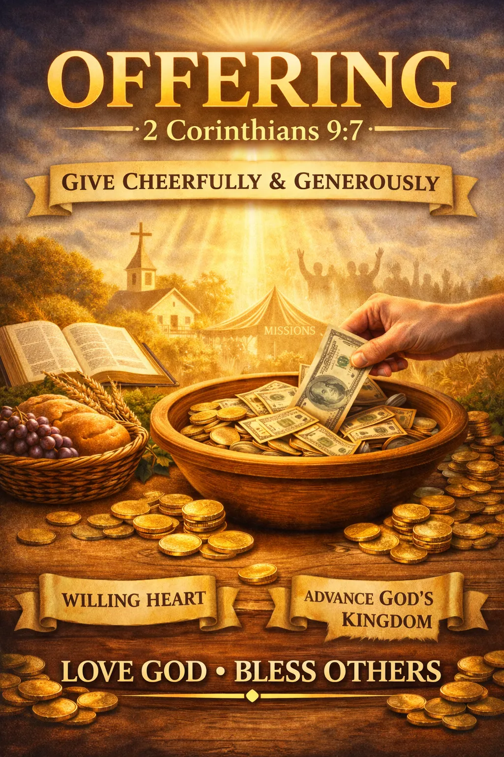 Offerings are freewill gifts given beyond the tithe as an expression of love, gratitude, and generosity toward God. Offerings reflect a willing heart that responds to God’s voice, supports ministry work, and advances the Kingdom through cheerful giving (2 Corinthians 9:6–8; Exodus 35:21). Offerings are also a form of giving of yourself and to others, because what we sow into God’s house becomes a blessing.